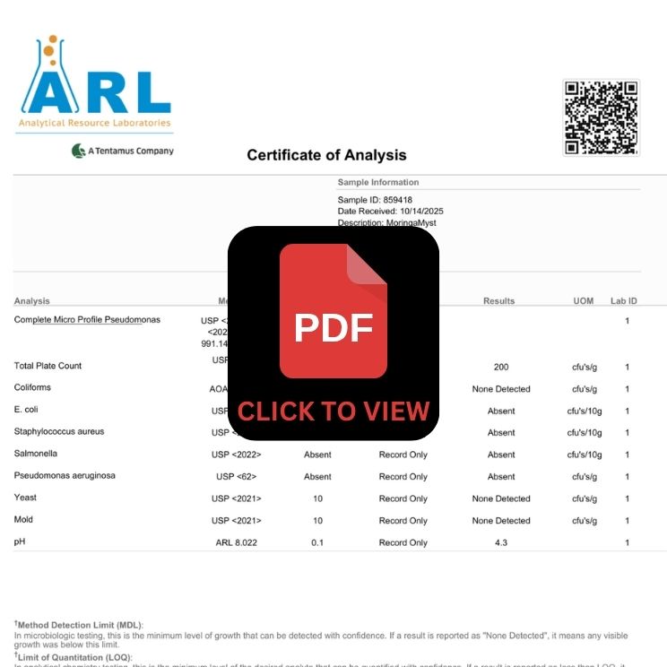 This myst harnesses the legendary power of moringa—known as the "Miracle Tree"—for its unmatched nutritional profile: 92+ verifiable nutrients, 40+ antioxidants, essential fatty acids, and all 20 amino acids.